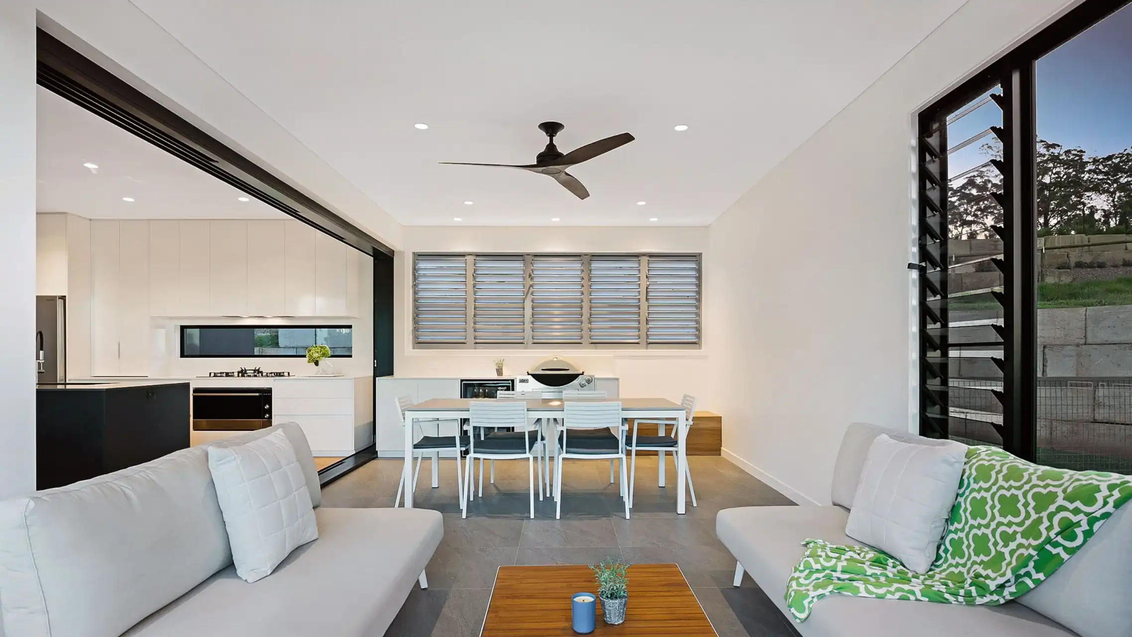 Angular Elegance features our Louvre Windows to ensure optimal airflow in two key spaces – the bathroom, and the indoor patio. These selections work in harmony with other Simply Doors & Window’s products featured throughout the home to maintain a seamless flow of fresh air.