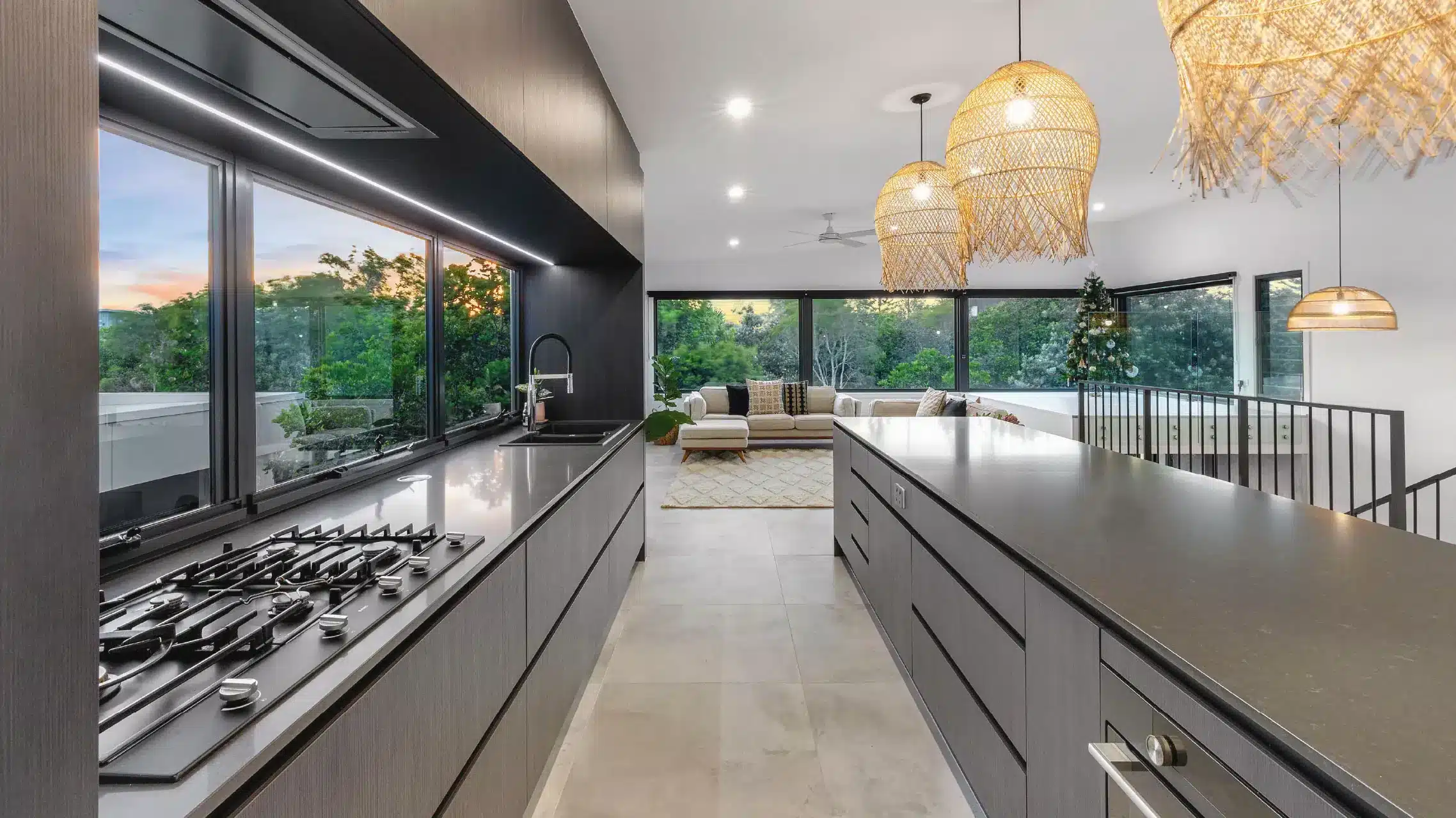 In the kitchen, traditional splashbacks are replaced with expansive Awning Windows โ welcoming in fresh air and framing breathtaking views. Throughout the living space, large Fixed Windows invite the outdoors in, while an indoor viewing platform offers uninterrupted sightlines to the central pool through dramatic floor-to-ceiling glazing.