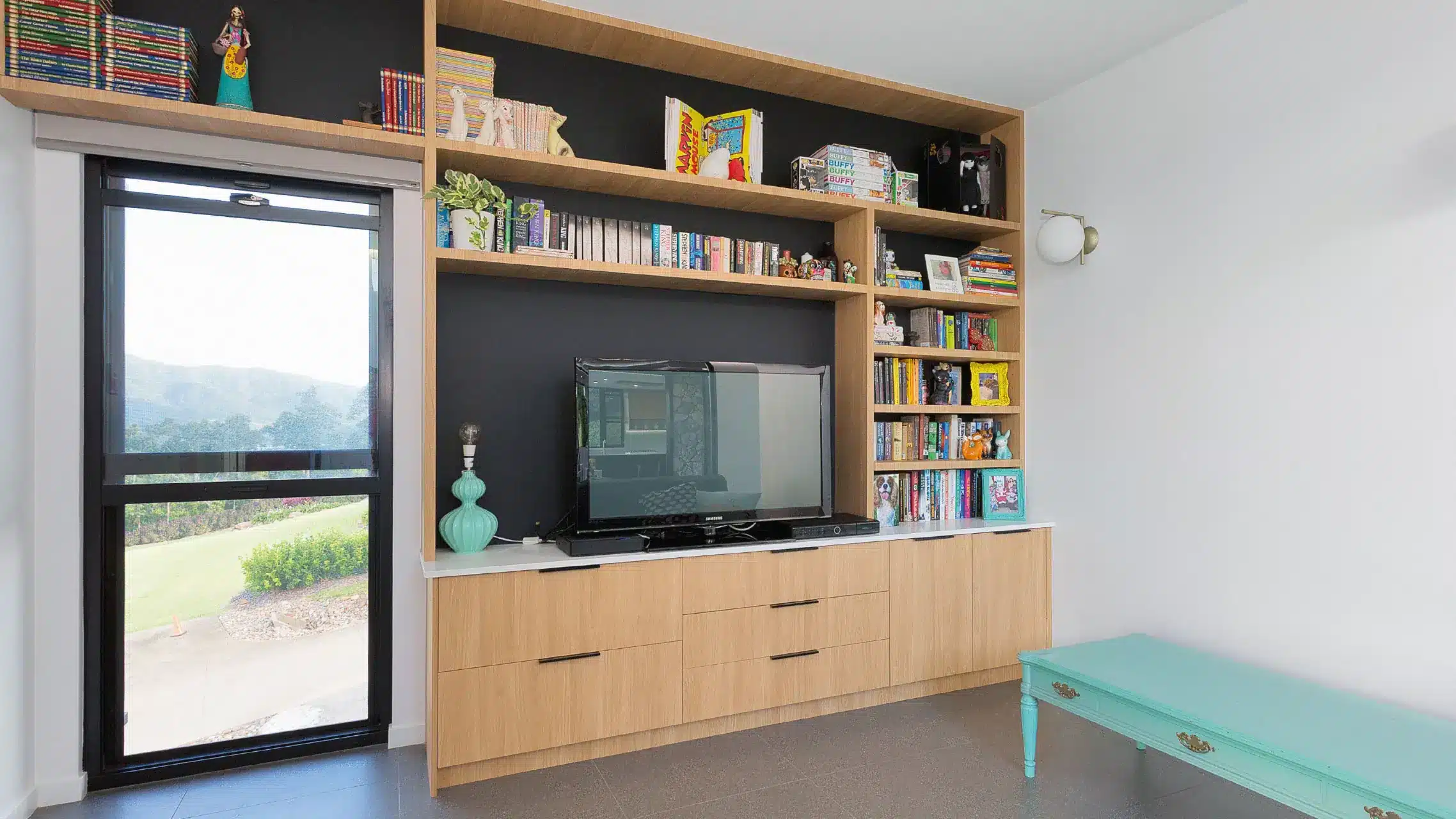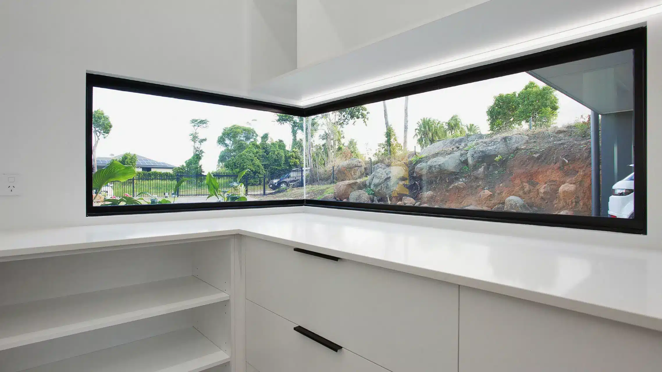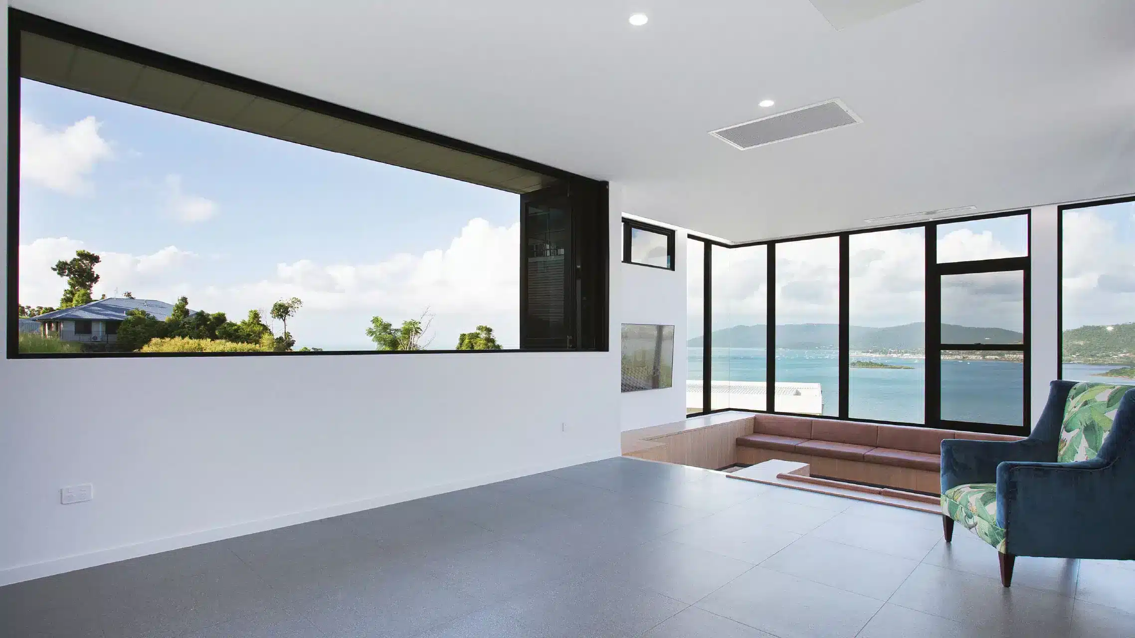 Black aluminium double-hung and fixed windows frame the coastal views, draw in natural light, and complement the modern aesthetic throughout the home. The double-hung windows can be opened via two panels that slide up and down in the frame to fill the home with the calming sea breeze.