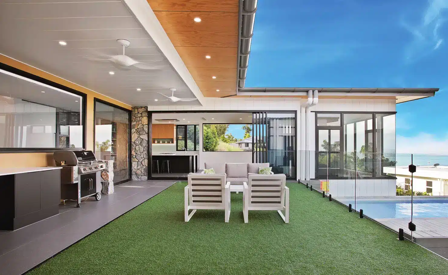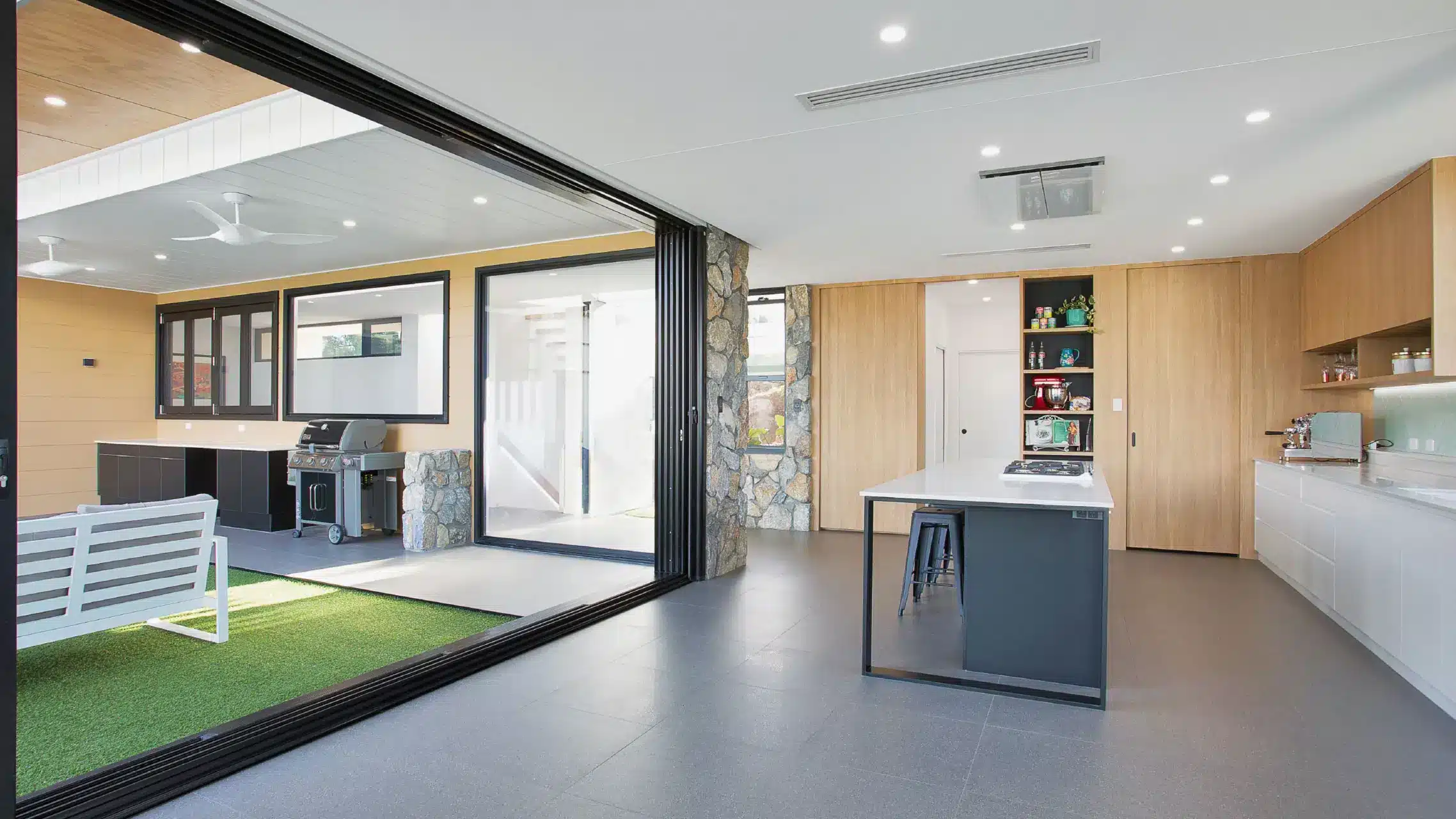 A stylish black cavity sliding door opens onto the outdoor entertaining and BBQ area from the homeโs beautiful timber, stone and monochrome kitchen. The door glides out of sight to enable free flow throughout the two spaces. In the living room, a chic black bi-fold window provides sweeping coastal views and a versatile concertina-style opening.