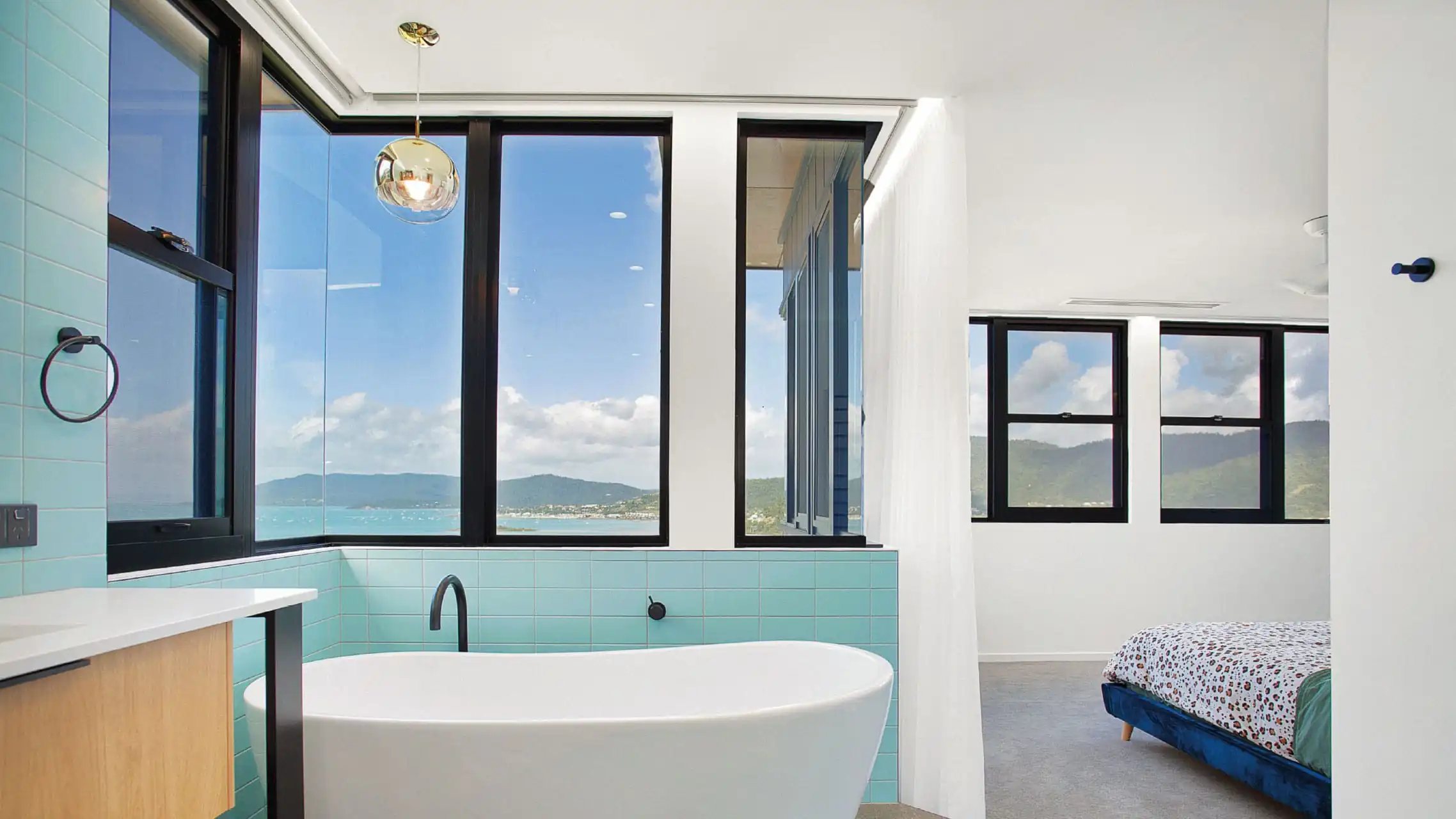 A luxurious freestanding bathtub with a soothing sea-blue tiled splashback sits below a series of black double-hung and fixed windows. The homeowners can create the perfect refuge by opening the windows to fill the space with ocean breeze, mountain views and natural light.