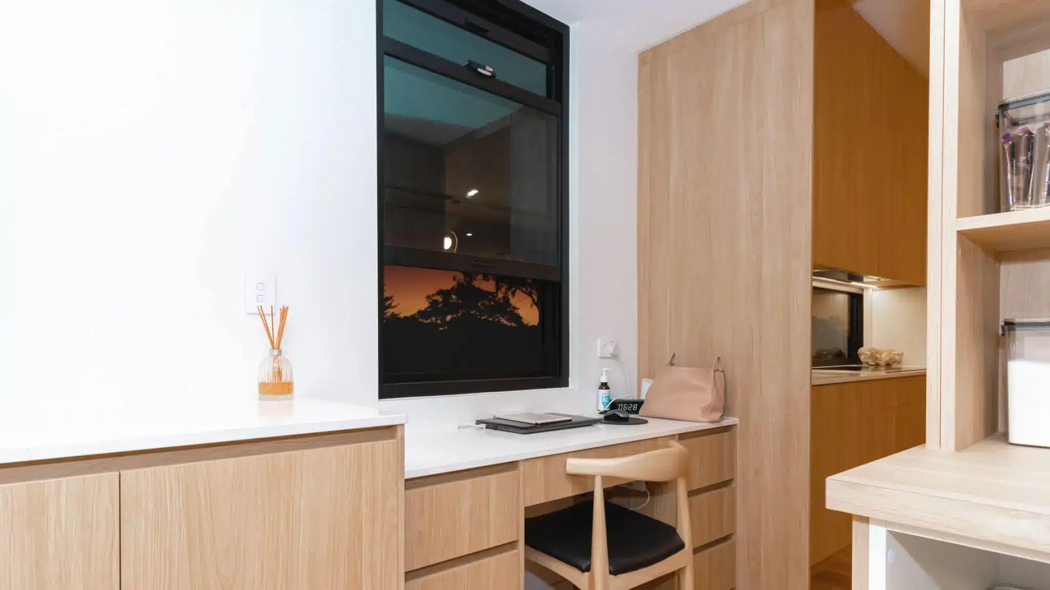 Through large cavity sliding doors, the indoor living/dining and kitchen area open up completely to a spacious deck with an outdoor kitchen, lounge and dining area. The deck provides magnificent city views that can be enjoyed outside or from indoors on cooler nights. On warm nights, a series of louvre windows with adjustable horizontal blades in the indoor dining space can be opened to allow fresh air to circulate.