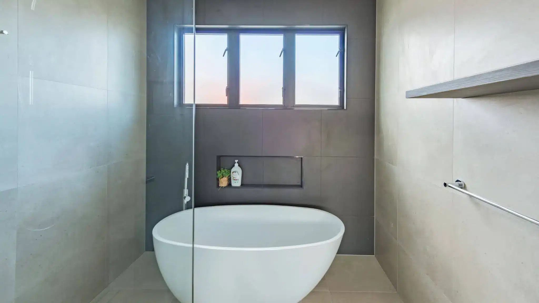 Black sliding doors provide a stylish entry into the spacious master bedroom and upstairs hall, with direct access to a large, L-shaped balcony overlooking the entertaining area and a picturesque jacaranda tree beyond. The balcony’s lounge is a peaceful setting for a glass of wine as the sun sets or a coffee as it comes up.