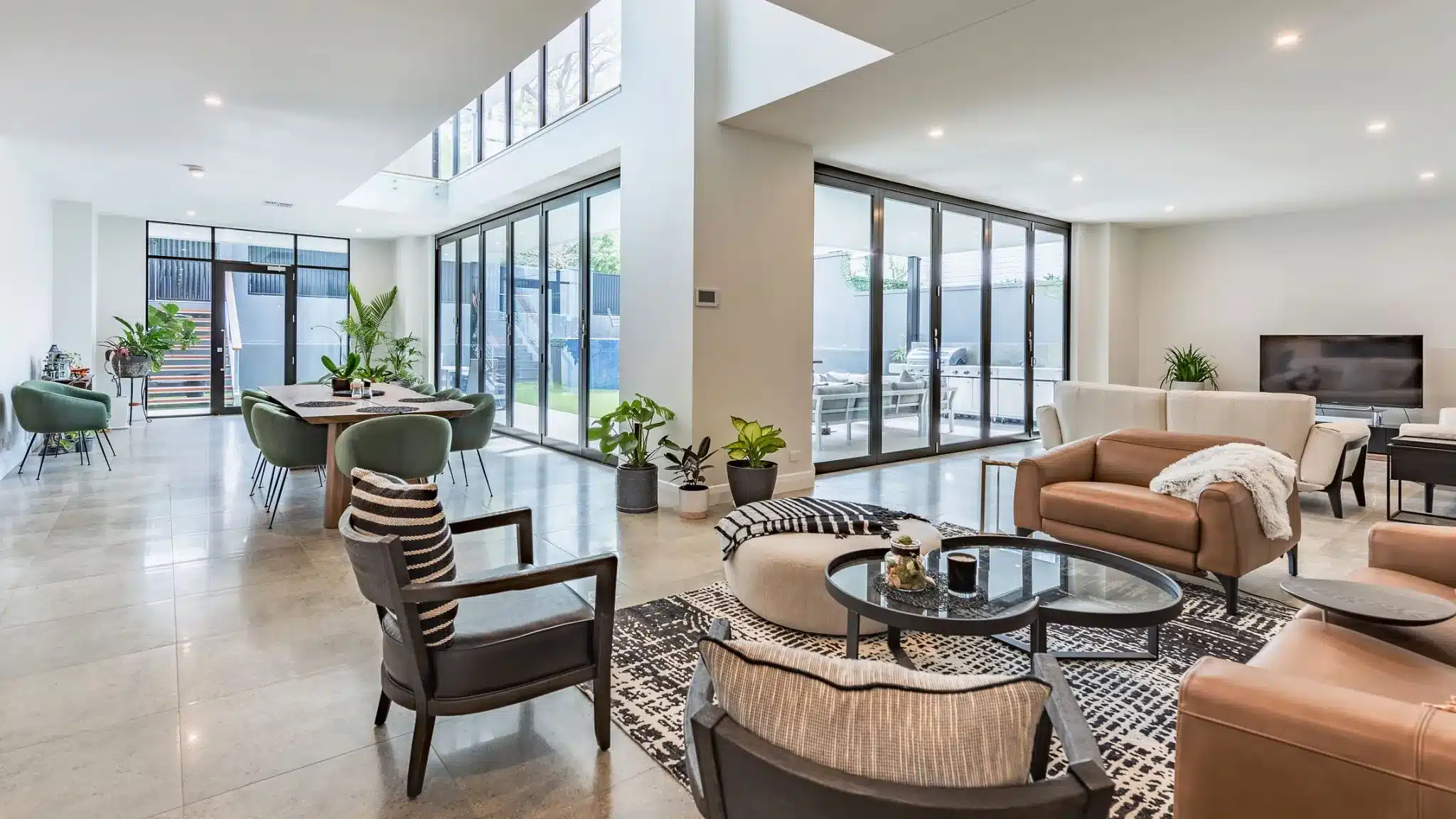 An open-plan design, dramatic high ceilings, large windows and glass doors throughout maximise space and flood the home with natural light.