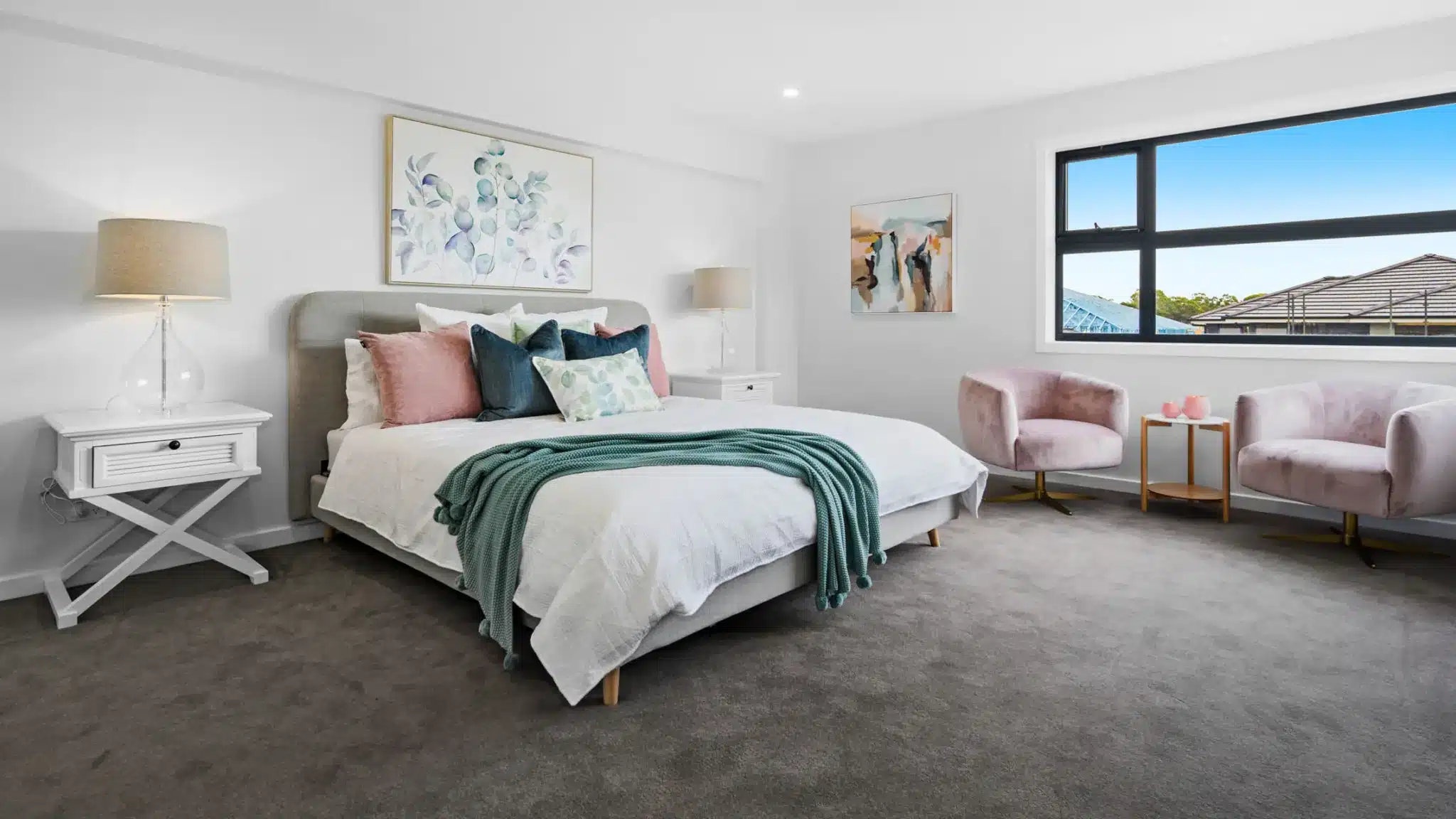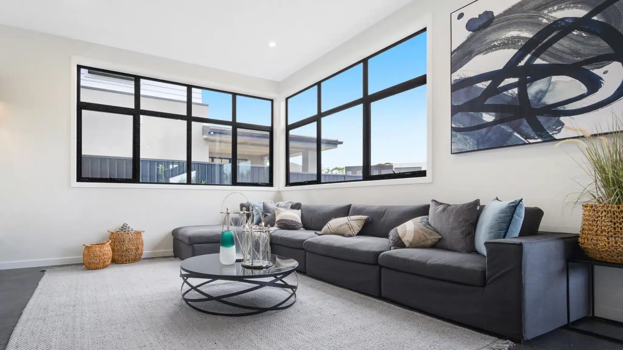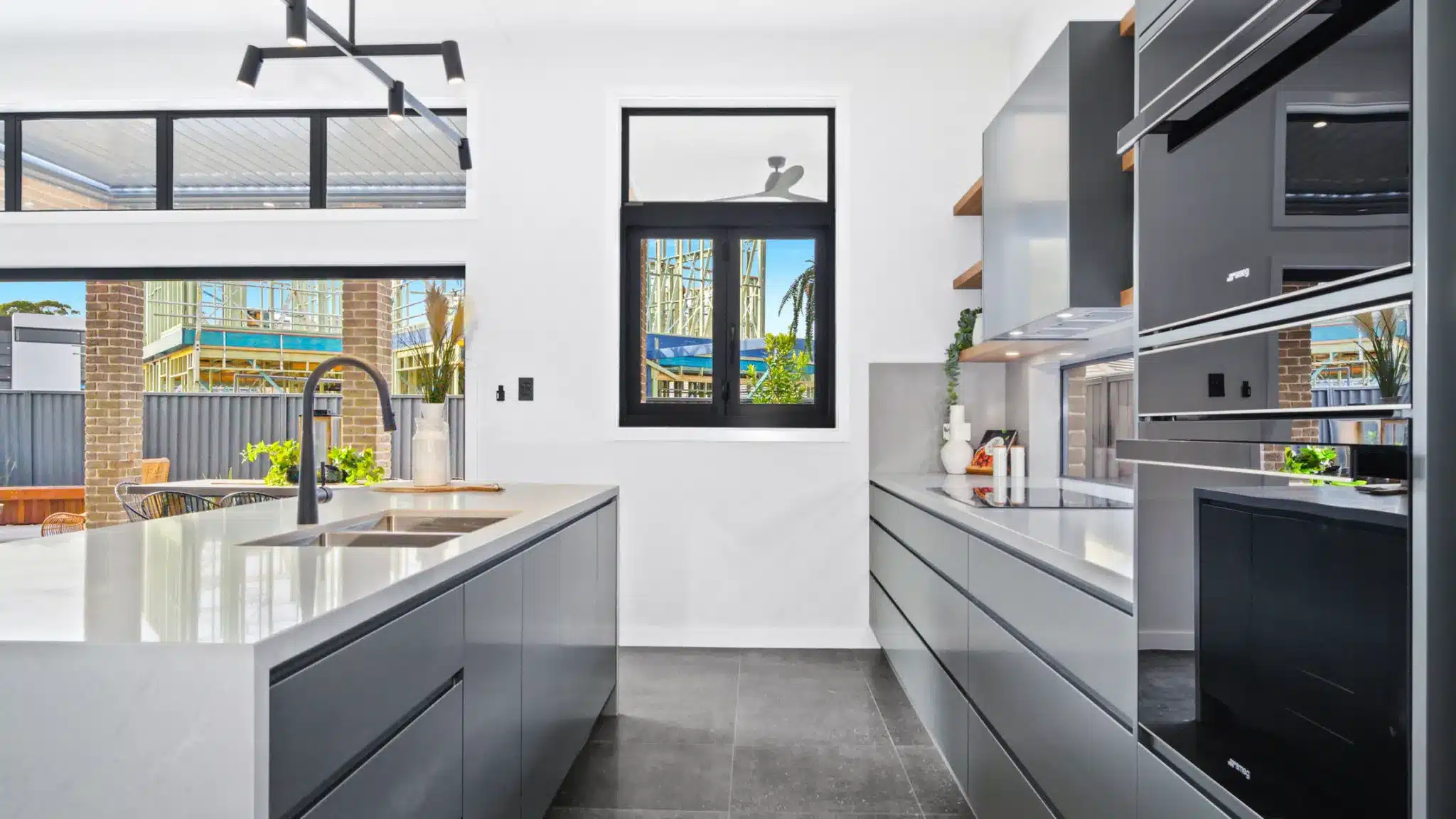 Each bedroom is deliberately oversized with awning windows combined with fixed hi-lite windows to draw in natural sunlight and airflow. Tall, cathedral-style raked ceilings with twin fixed light hi-lite windows illuminate the huge stairwell and its ascent to the upper first floor. In the open-plan dining area, a series of fixed windows feature above the bi-fold doors and open up the space even more. An aluminium fixed window replaces a tiled splashback in the kitchen to brighten up the space and showcase outside views.