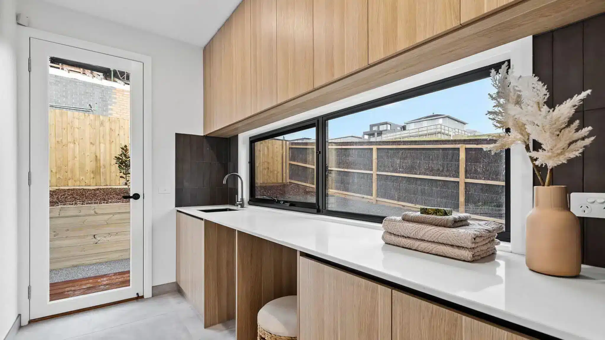 The sleek aluminium framing that hallmarks Simply Doors & Window’s doors add an extra element of visual contrast, complementing the terraceโs raw timber tones throughout the homeโs features effortlessly. These doors can be stacked to just one panel in one easy swipe, to reveal expansive views of the outdoor space.