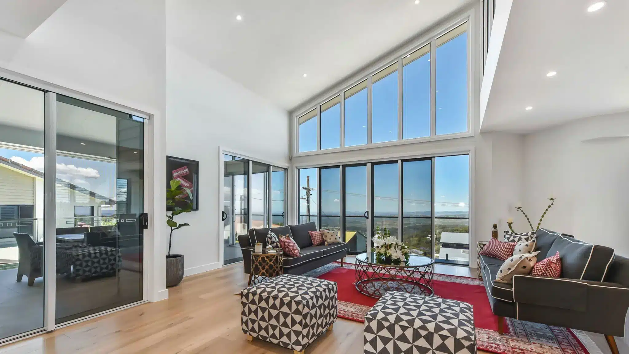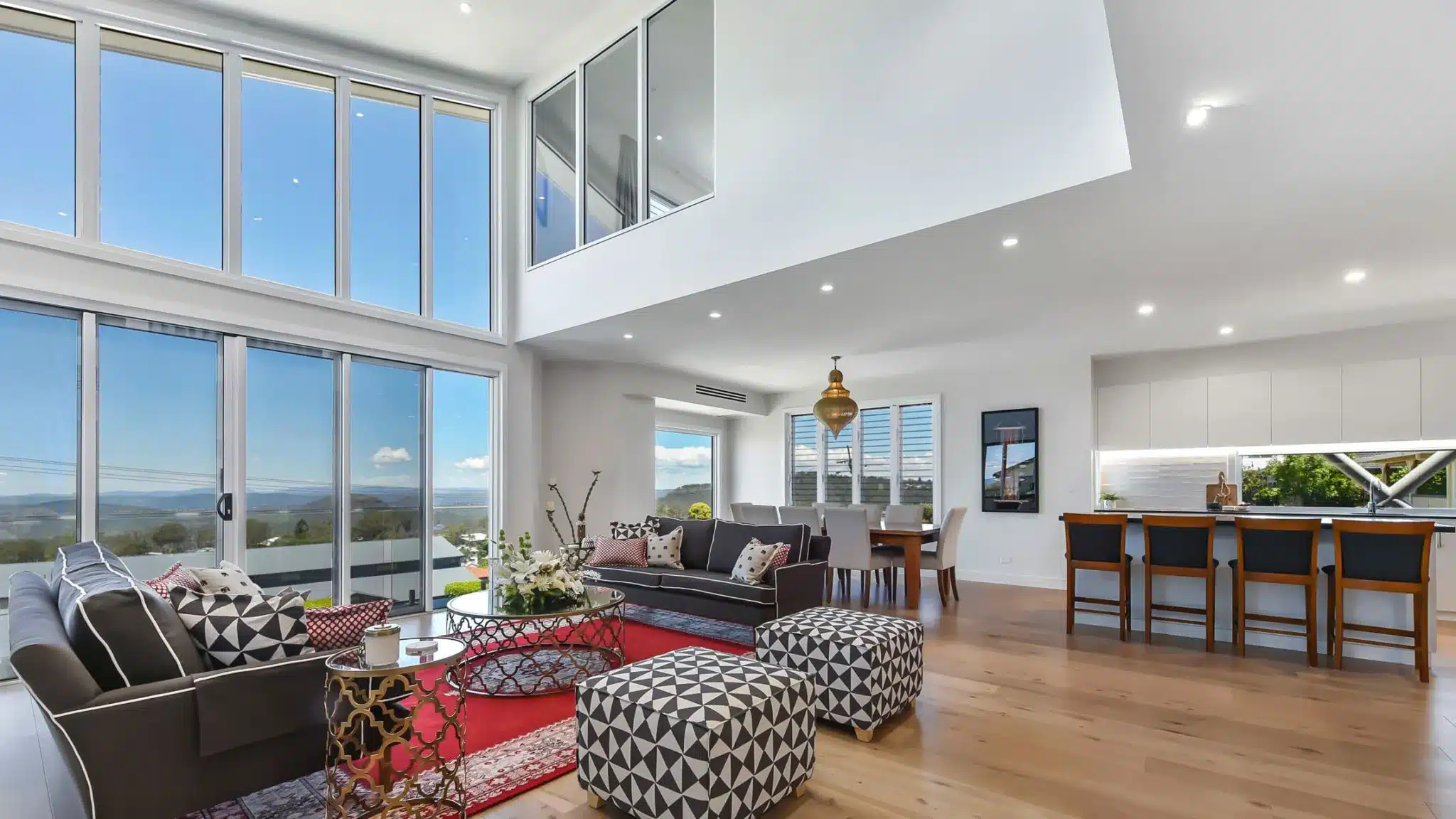 As you enter the living room, your gaze is immediately drawn upward towards large raked windows that emphasise the height and expanse of the area, flooding the home with morning sunlight and offering a picturesque view of its stunning surroundings.