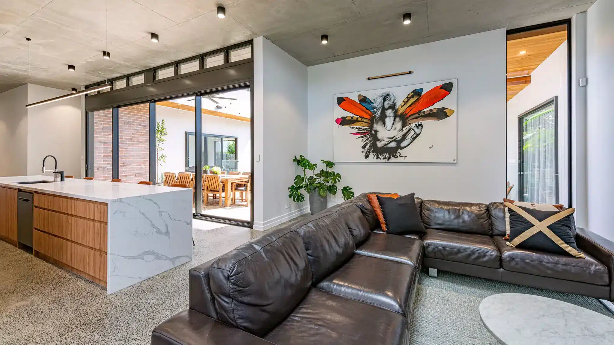 Throughout the home, Simply Doors & Window’s black aluminium windows and glass doors evoke an industrial vibe whilst also inviting in beautiful views, refreshing airflow, and a relaxing ambience.