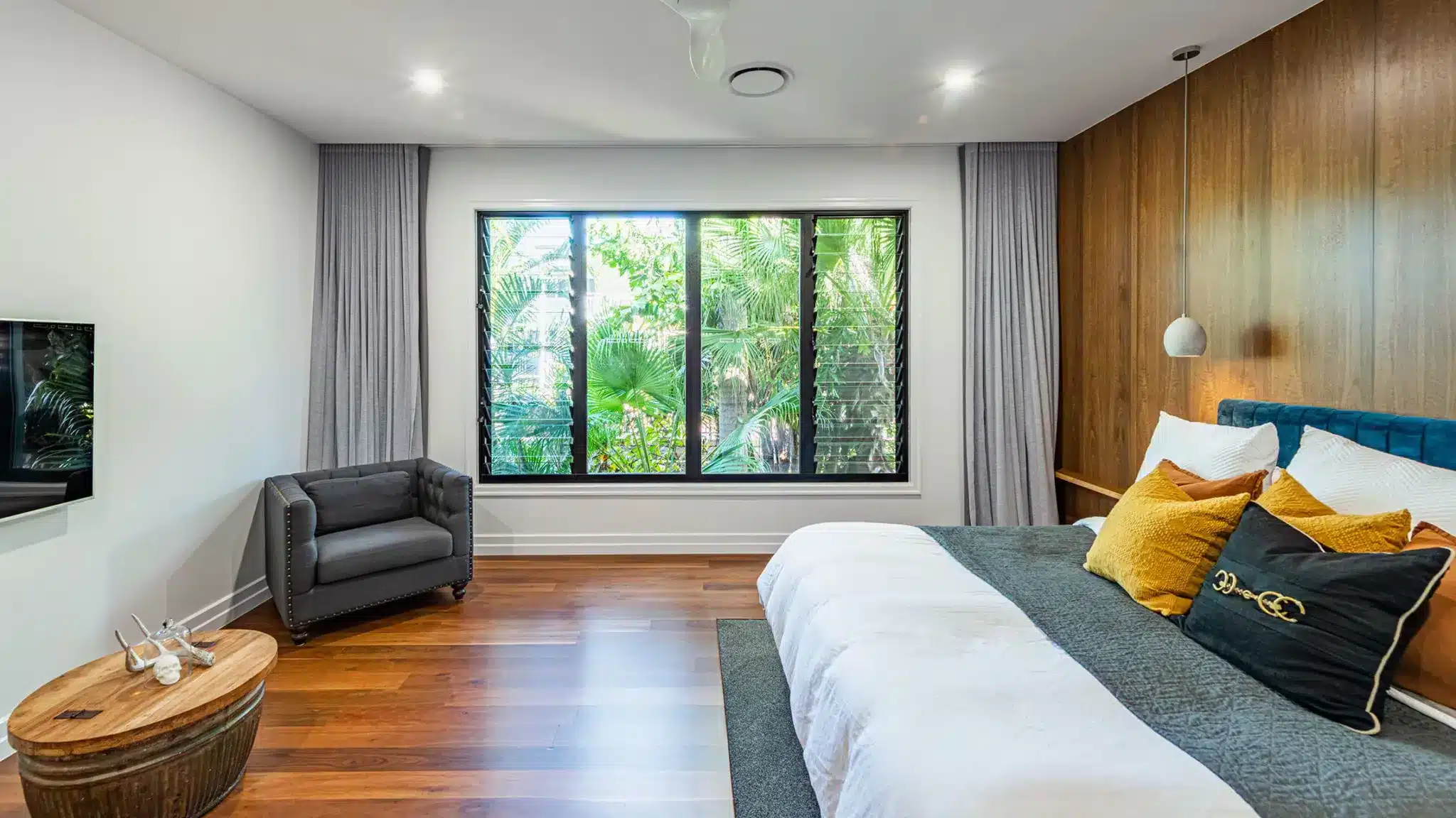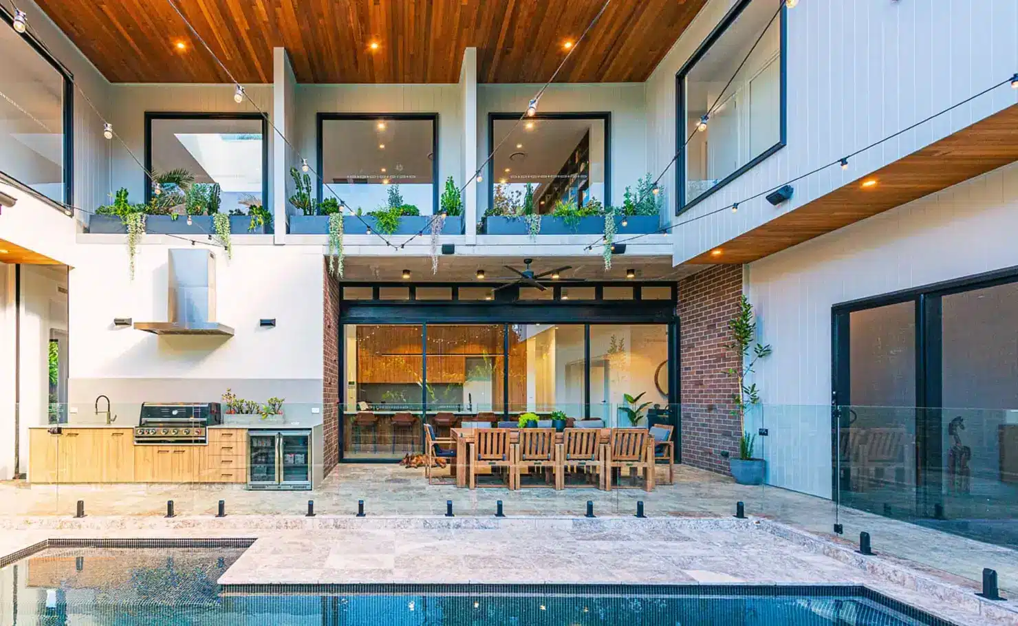 Simply Doors & Window’s enlarged aluminium Sliding Doors lead seamlessly from the timber-accented kitchen and bar to the alfresco dining and pool area. Creating a seamless connection between indoors and outdoors, these selections are perfect for Brisbaneโs tropical climate.
