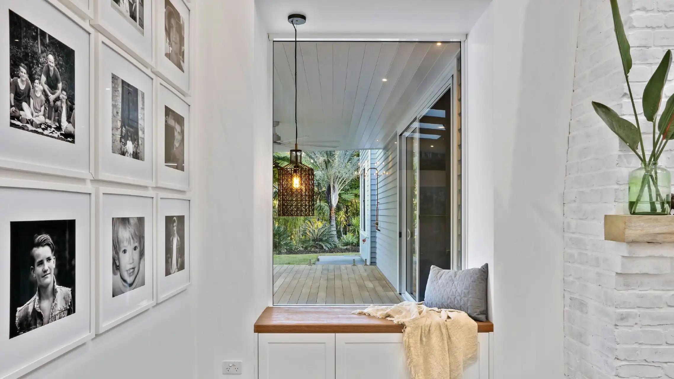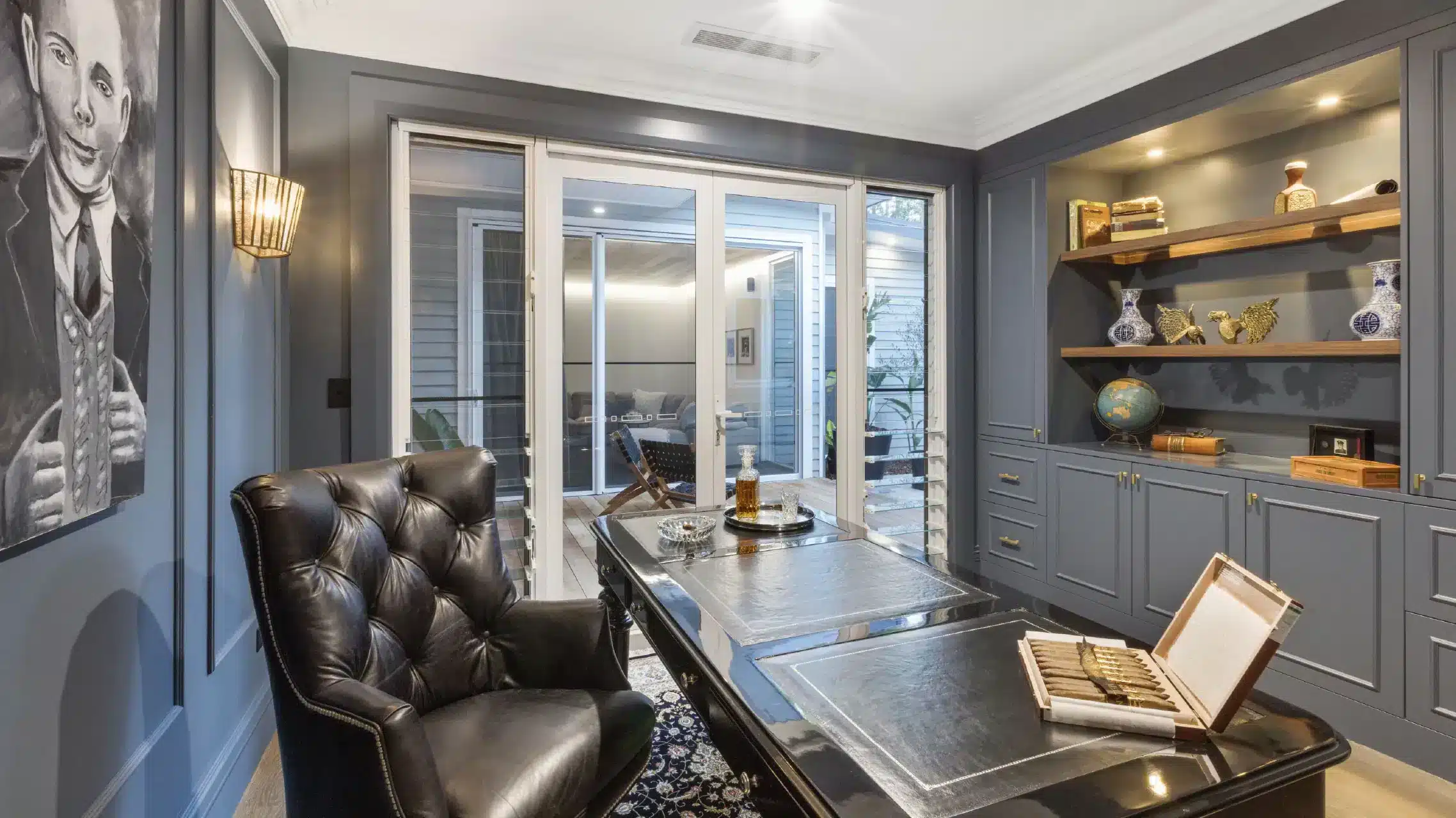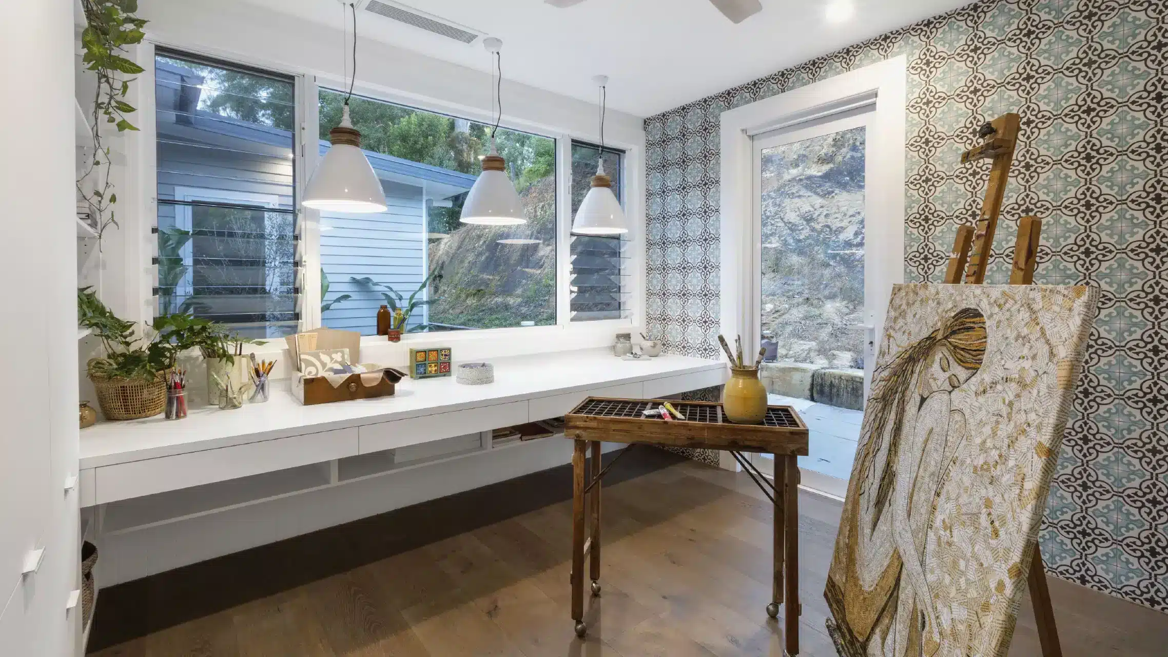 The resort-style master bedroom epitomises the homeโs effortless elegance. With stunning views, sliding doors lead to a timber deck and pool area with a lush garden backdrop. An artistโs studio is a stunning addition to the home. It showcases inspiring views of the sandstone feature wall via a series of fixed windows and breezy louvre windows, while a single hinged glass door provides easy garden access.