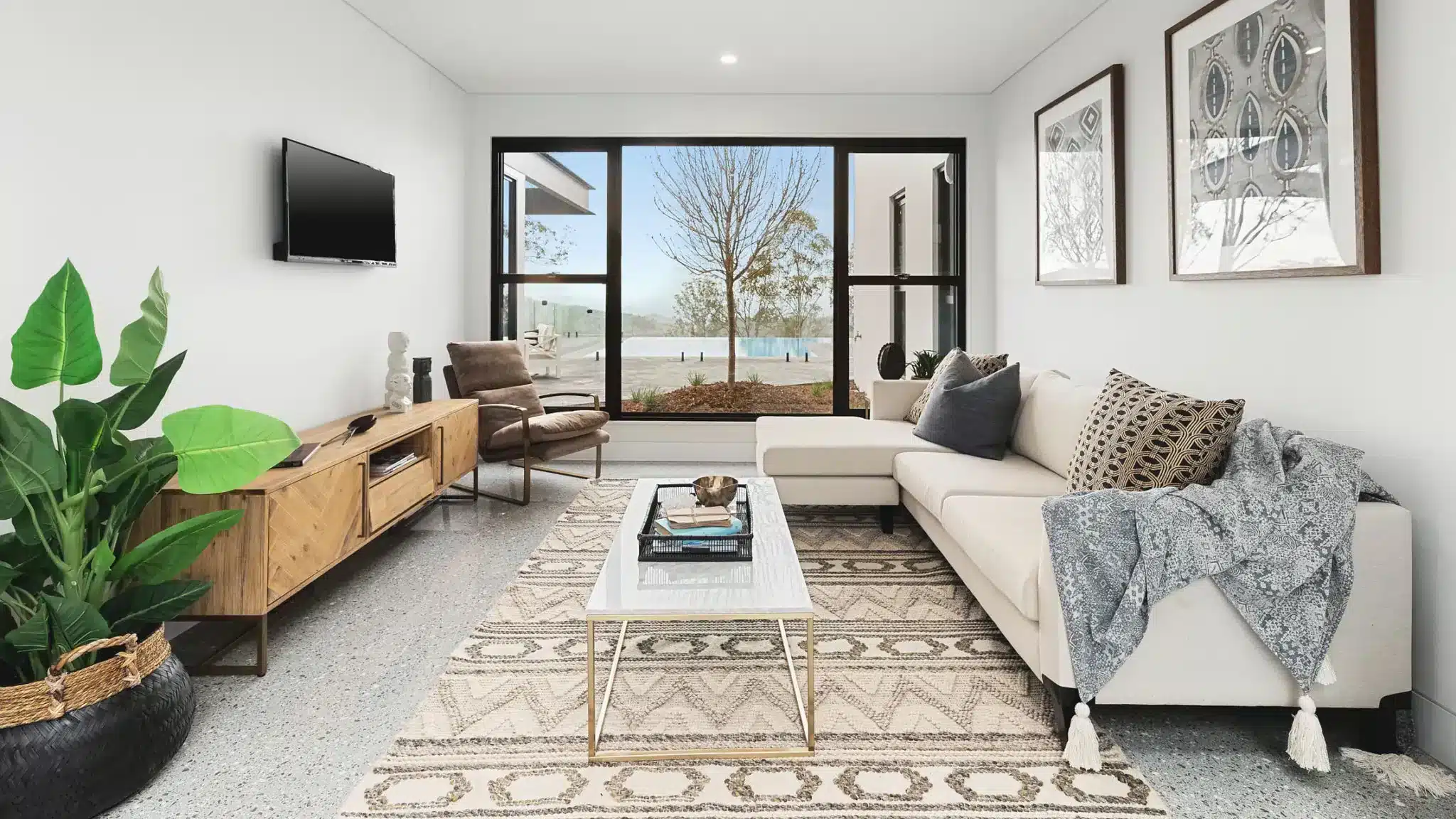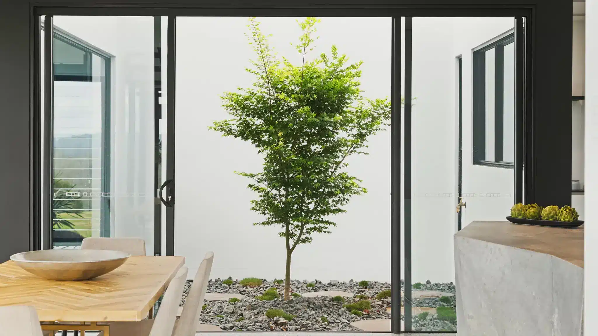 Simply Doors & Window’s Sliding Doors, in their signature sleek black framing, encase the atrium โ offering an uninterrupted view of the space and stacking out of sight to cast the