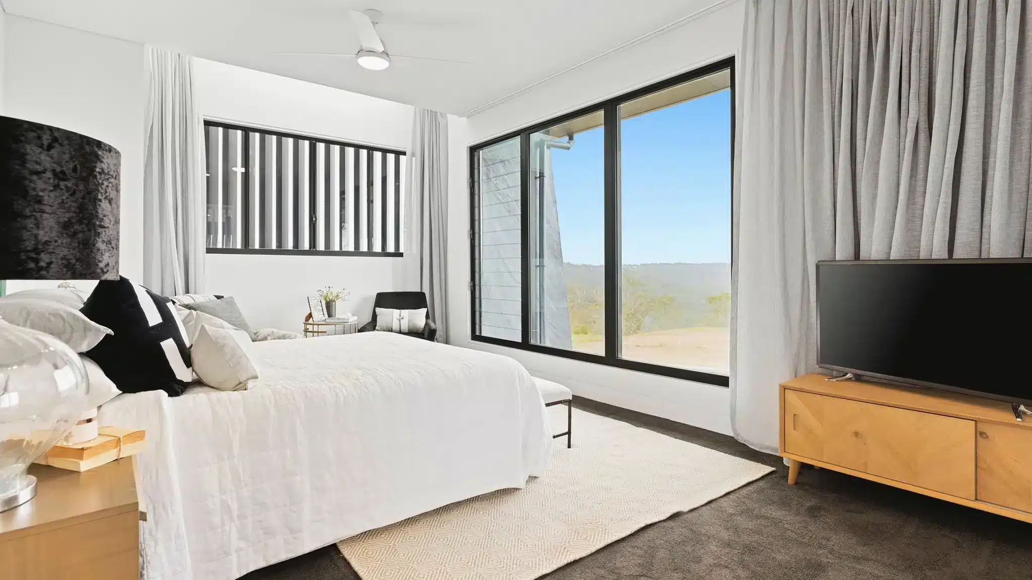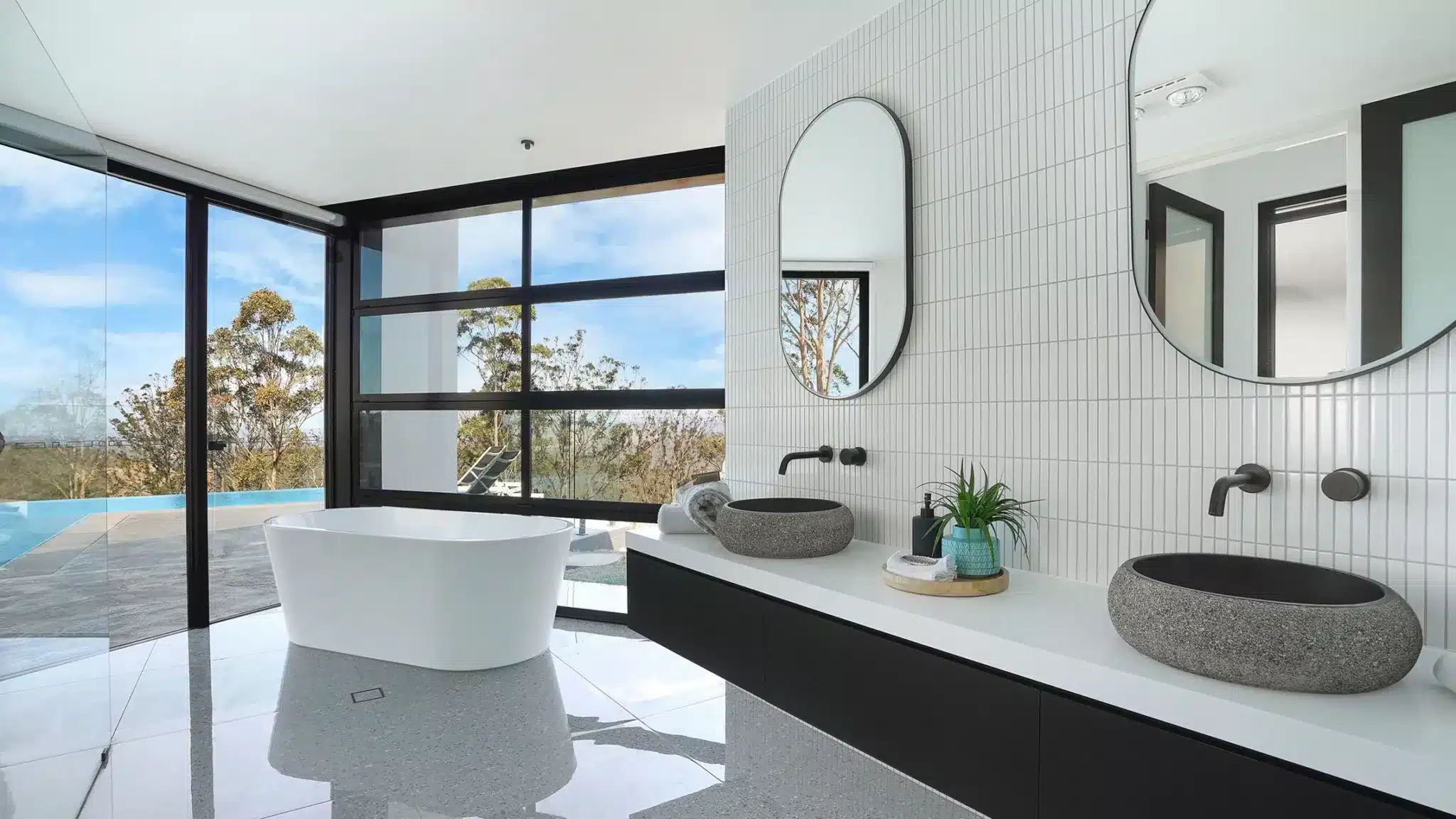 Simply Doors & Window’s Black Aluminium Fixed Windows were meticulously positioned to offer expansive views of the surrounding scenery, including the lush greenery and the magnesium heated infinity pool. The serene atmosphere is completed with sweeping multi-storey floor-to-ceiling views of the picturesque landscape, achieved through the careful placement of our Fixed Windows atop Stacking Sliding Doors.