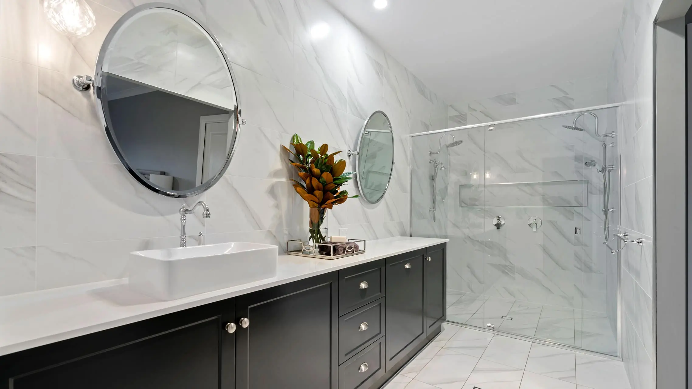 A custom cornice to the cathedral-style ceiling in the entrance offers a grand, bespoke feeling. A water feature, visible through two double-hung windows in the entrance and accessible through sliding doors, sets the tone for relaxation. All bedrooms have calming bush land or sunset views through classic three-panel sliding windows that allow sunlight, breeze, and the surrounding natural beauty into the home.